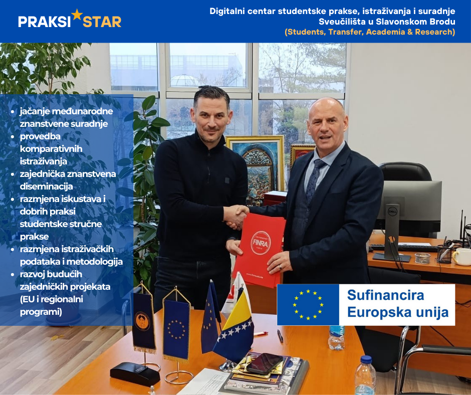Tijekom susreta usuglašen je i sporazum o suradnji između Sveučilišta u Slavonskom Brodu i Univerziteta FINRA Tuzla, čime su dodatno učvršćeni temelji međunarodne znanstveno-istraživačke suradnje te otvorene mogućnosti za razvoj budućih zajedničkih projekata i akademskih inicijativa.