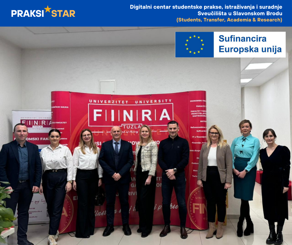 Voditelj projekta PRAKSI★STAR, doc. dr. sc. Hrvoje Sivrić, zajedno s voditeljima radnih paketa doc. dr. sc. Mirkom Cobovićem, doc. dr. sc. Lenom Sigurnjak i doc. dr. sc. Andrejom Katolik Kovačević, bili su u radnom posjetu Univerzitetu FINRA Tuzla u okviru provedbe projekta PRAKSI★STAR – Digitalni centar studentske prakse, istraživanja i suradnje (šifra projekta NPOO-007).
