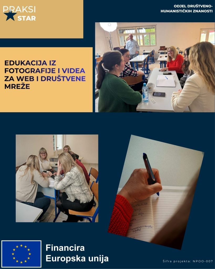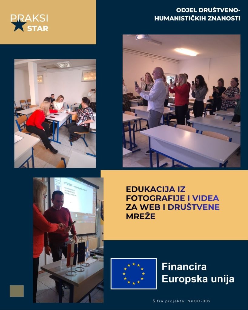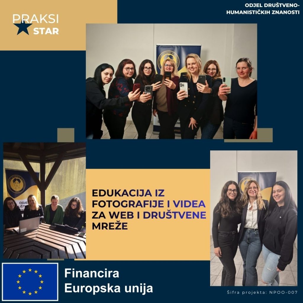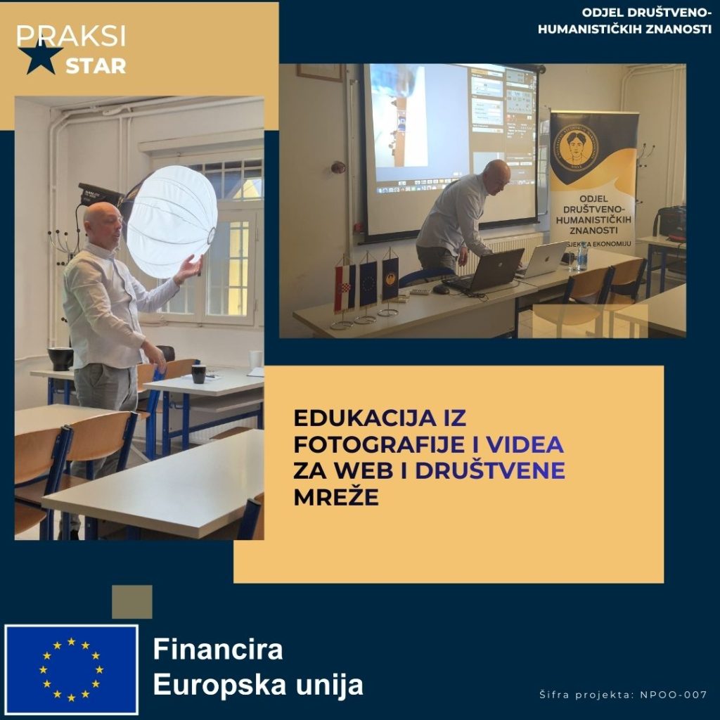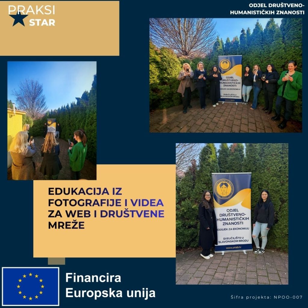 U sklopu projekta Digitalni centar studentske prakse, istraživanja i suradnje Sveučilišta u Slavonskom Brodu – PRAKSI★STAR (Students, Transfer, Academia & Research), šifra projekta: NPOO‑007, 2. i 3. ožujka 2026. na Sveučilištu u Slavonskom Brodu održana je dvodnevna edukacija usmjerena na razvoj kompetencija u području fotografije, videoprodukcije i izrade vizualnog sadržaja za web i društvene mreže.